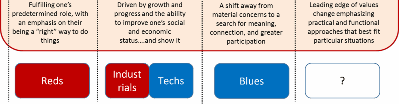 It is really hard to see fundamental change in Tier 1 mindsets that believe their values are the right values for everybody. We see tribalism in play today and the stalemate it engenders. While the overlay is not 100% accurate, it is close enough to say that the reds are mostly traditionals, and the blues are mostly postmoderns. Their percentages in the US are roughly equal, in the mid-20s (it is very difficult to pin down the precise numbers). The long-term trend favors the blues/postmoderns. The moderns, currently the biggest type, are the biggest supporters of capitalism, and are also evenly split: the “declining” industrial manufacturing base moderns lean red and the “emerging” high-tech base lean blue.