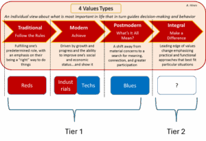 Another way to phrase this is: From ONE-RIGHT-WAY (traditional, modern, and postmodern) VALUES to MULTIPLE WAYS (integral) is the #1 shift needed for After Capitalism. Integral values are the first 2nd-tier type to emerge. The tier concept comes from Beck and Cowan’s (1996) Spiral Dynamics. The distinction is that holders of Tier one values believe […]