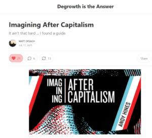 The After Capitalism plot is thickening. Check out this nice review of the book on Substack. But perhaps more interesting is who it came from and the work he and his institute are doing! Matt Orsagh founded the Arketa Institute to lend focus to his work on post-growth finance. His substack is Degrowth is the […]