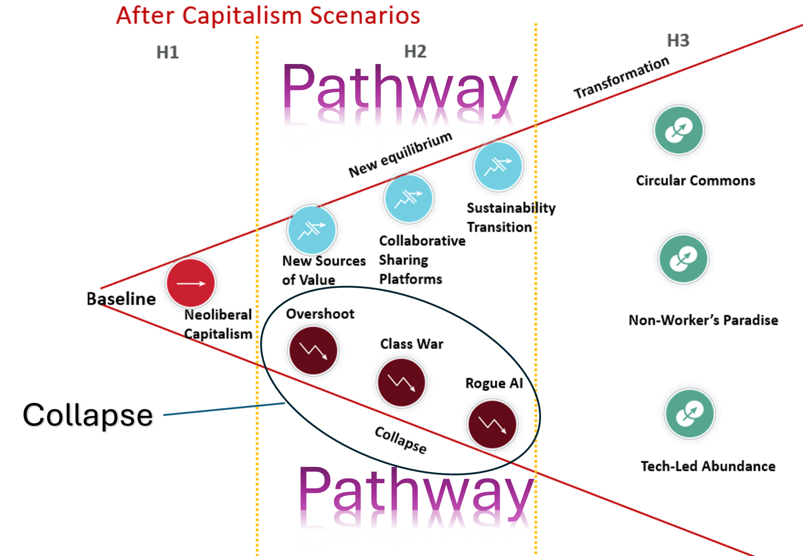 Let’s review the flow. As the Horizon 1 Baseline, Neoliberal Capitalism, declines, the seeds of a new system in Horizon 3 are emerging. These are our thee AC images. But our research suggests it is very rare that we leapfrog from H 1 to H3. There is a transition phase, Horizon Two, with the major types of transitions: